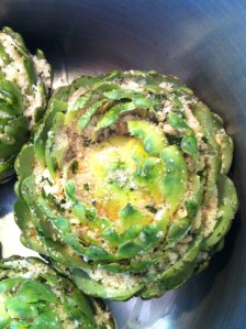 Gently ease the leaves of the artichoke open starting on the outside and stuff crumb mixture into each leaf going around and around until you get to the very firm centre heart bit. You probably won’t be able to get any more crumbs into there.