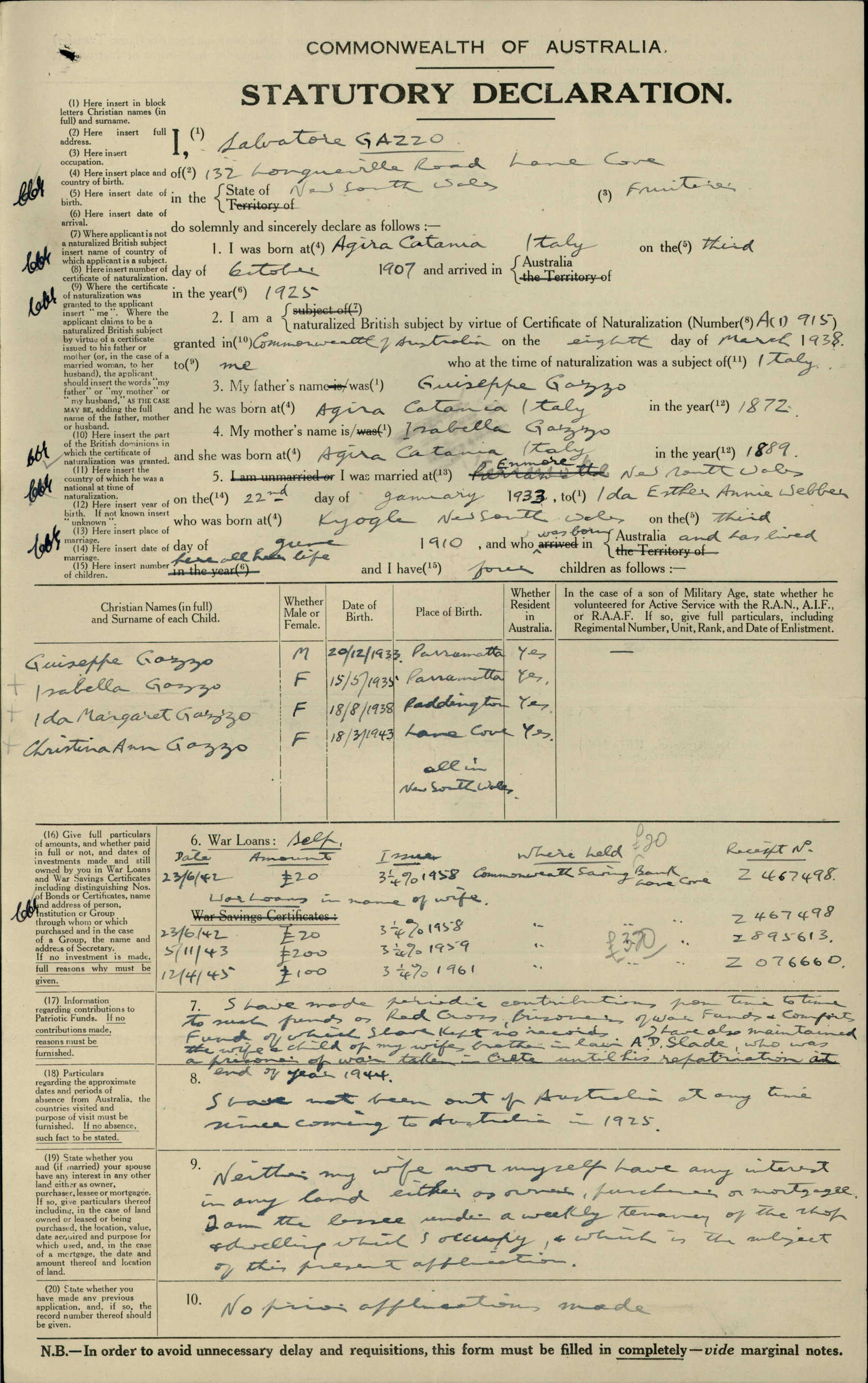 This is a young dad outside the shop with Aunty Maria, Alex Correy and a very little Joe. It is certainly before the war as the name changed from Gazzo to Mum’s maiden name Webber. I don’t know where it it but probably Newtown or Paddington. Aunty Maria seem to live with us on and off and Midge tells us she was spiteful and always pinching them. Alex was a family friend who worked at Concord Hospital (I don’t know what he did there). He was very tall and grew to be very wide as well as I remember he got stuck in our lounge chair and had to be pulled out.