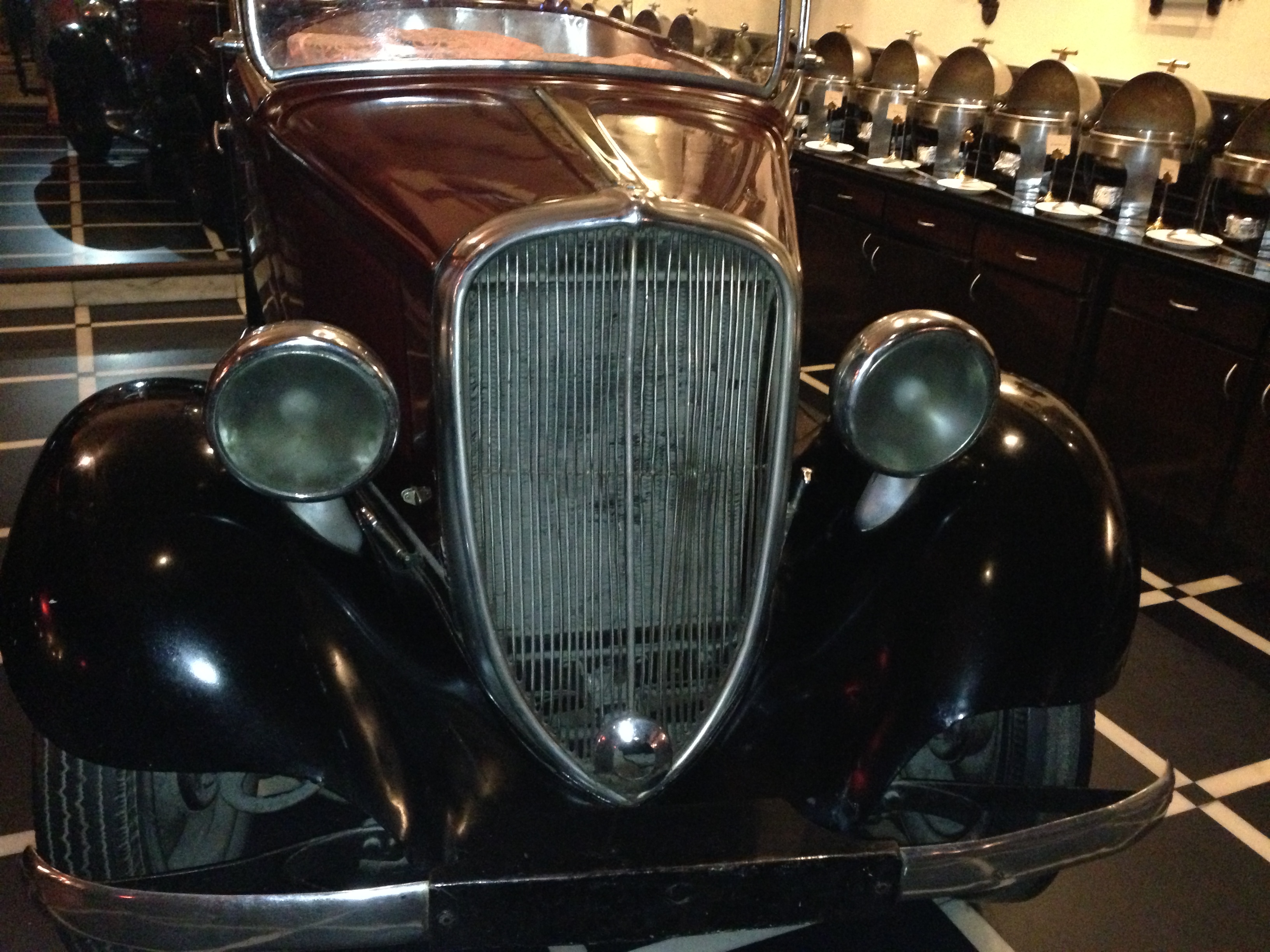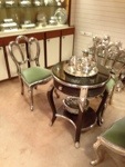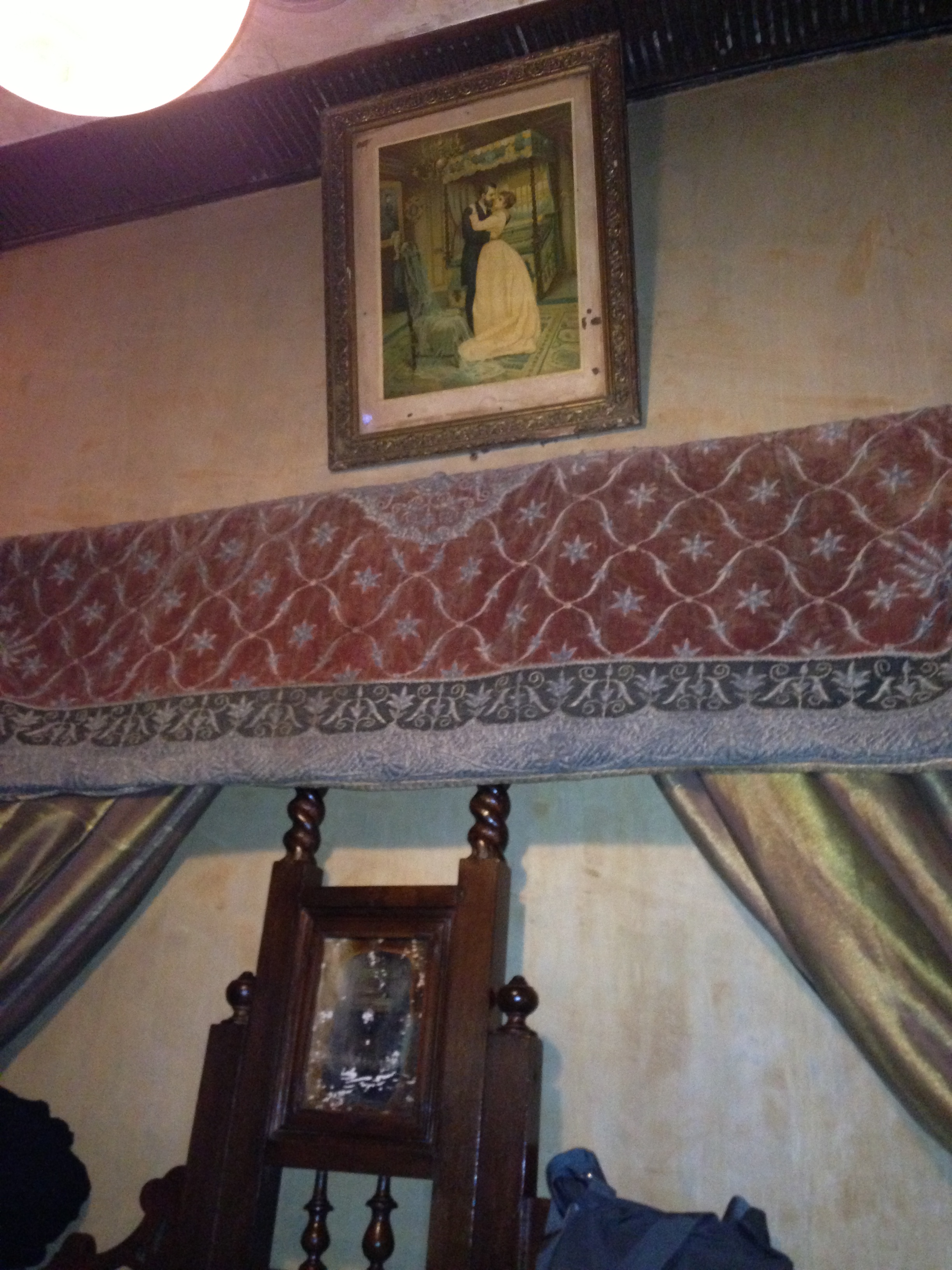 Up above it there is an old photo of the bed with a couple dancing a waltz at the end of the bed. The other tables had lovely stained glass lamps on and over them.